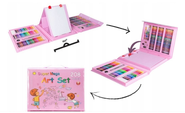 Contenuto: 12 pennarelli spessi, 24 matite colorate, 24 pastelli a cera, 48 pastelli a olio, 18 acquerelli di vari colori, 24 pennarelli, 40 punti metallici, Pennello, Temperamatite, Gomma, 4 graffette, Matita di grafite, Colla, 10 fogli bianchi A4, Spugna per acquerelli