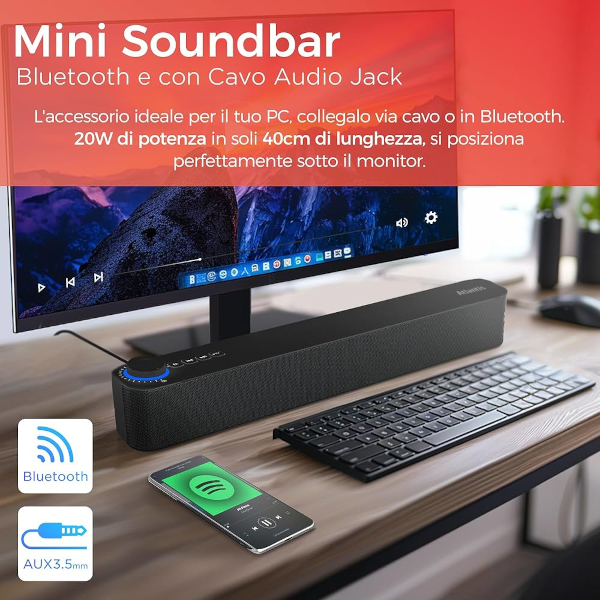 Mini Soundbar Potente da 20W / 2 Canali da 10W ciascuno.