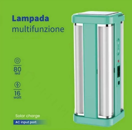 LAMPADA DI EMERGENZA MULTIFUNZIONE 80 LED 16W CON RICARICA SOLARE + INGRESSO AC