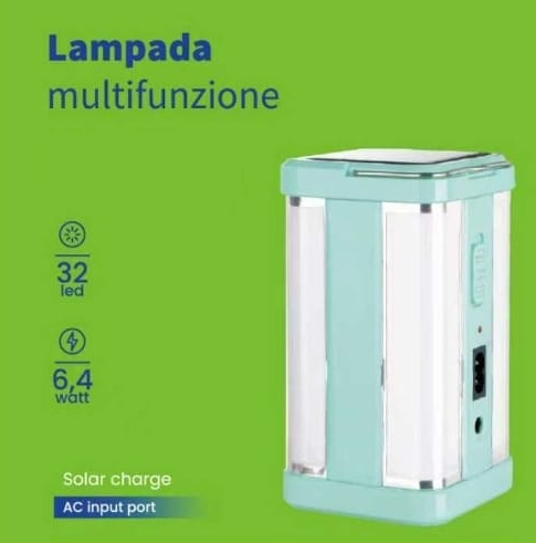 LAMPADA DI EMERGENZA MULTIFUNZIONE 32 LED 6.4W CON RICARICA SOLARE + INGRESSO AC