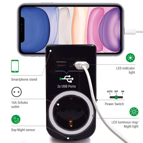 ADATTATORE 1 SCHUKO 16A + 2 USB 2.4A/5V CON SUPPORTO E SENSORE DIURNO/NOTTURNO NERO