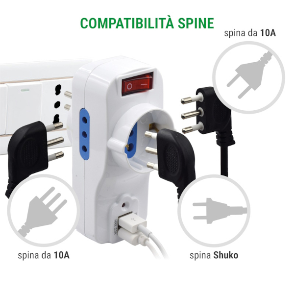 -2 prese di corrente per spine italiane (10a) + 1 presa schuko 10a + 2 USB 2.1A/5V