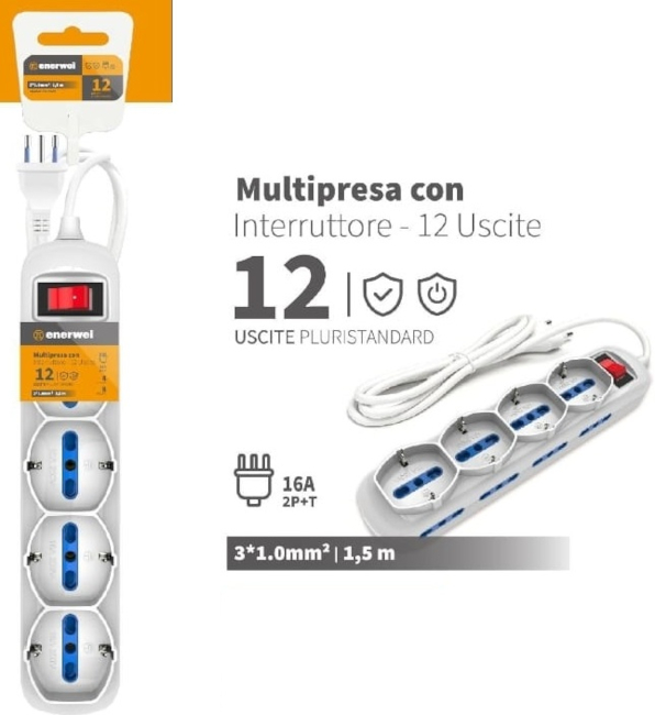 MULTIPRESA CON INTERRUTTORE A 12 USCITE 16A 250V MAX 3680W 1.5M