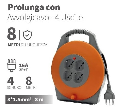PROLUNGA CON AVVOLGICAVO 4 USCITE SCHUKO 16A 1110W 8M